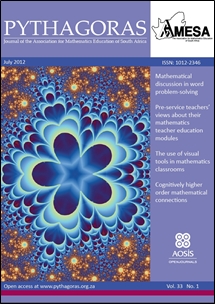 Pythagoras serves as an academic and professional forum for the presentation and critical discussion of current research and developments in Mathematics Education in South Africa and internationally. Pythagoras publishes original papers that significantly contribute to our understanding of mathematics teaching, learning and curriculum, including reports of research, critical analyses of mathematics curricular and teacher development initiatives, theoretical analyses, and commentaries on issues relating to the teaching and learning of mathematics at all levels of education.. Pythagoras is a peer-reviewed journal, accredited by the SA Department of Higher Education and Training. A paper edition of Pythagoras is published once a year and distributed to all members of AMESA. Pythagoras is now published online Open Access at http://www.pythagoras.org.za Pythagoras is also available online to subscribers and AMESA members through Sabinet's African Journals platform at https://journals.co.za/journal/amesapTo access the journal online, paid-up members may request the necessary login details by e-mail from the AMESA secretariat - . |